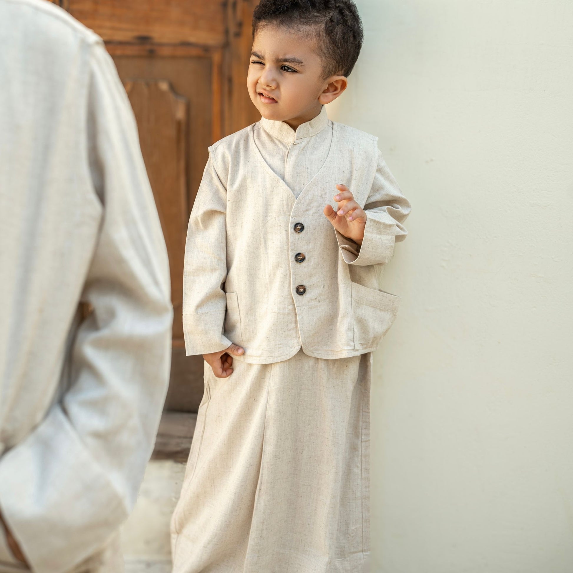 دشداشة لنن مع صديري لنن بثلاث زراير ماربل ومخباة جانبية كبيرة تمتد من الأمام للخلف.