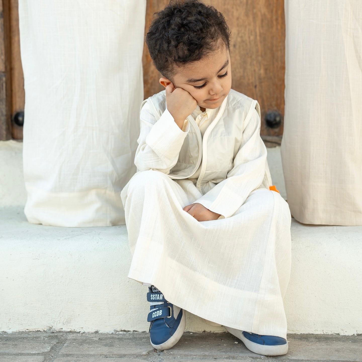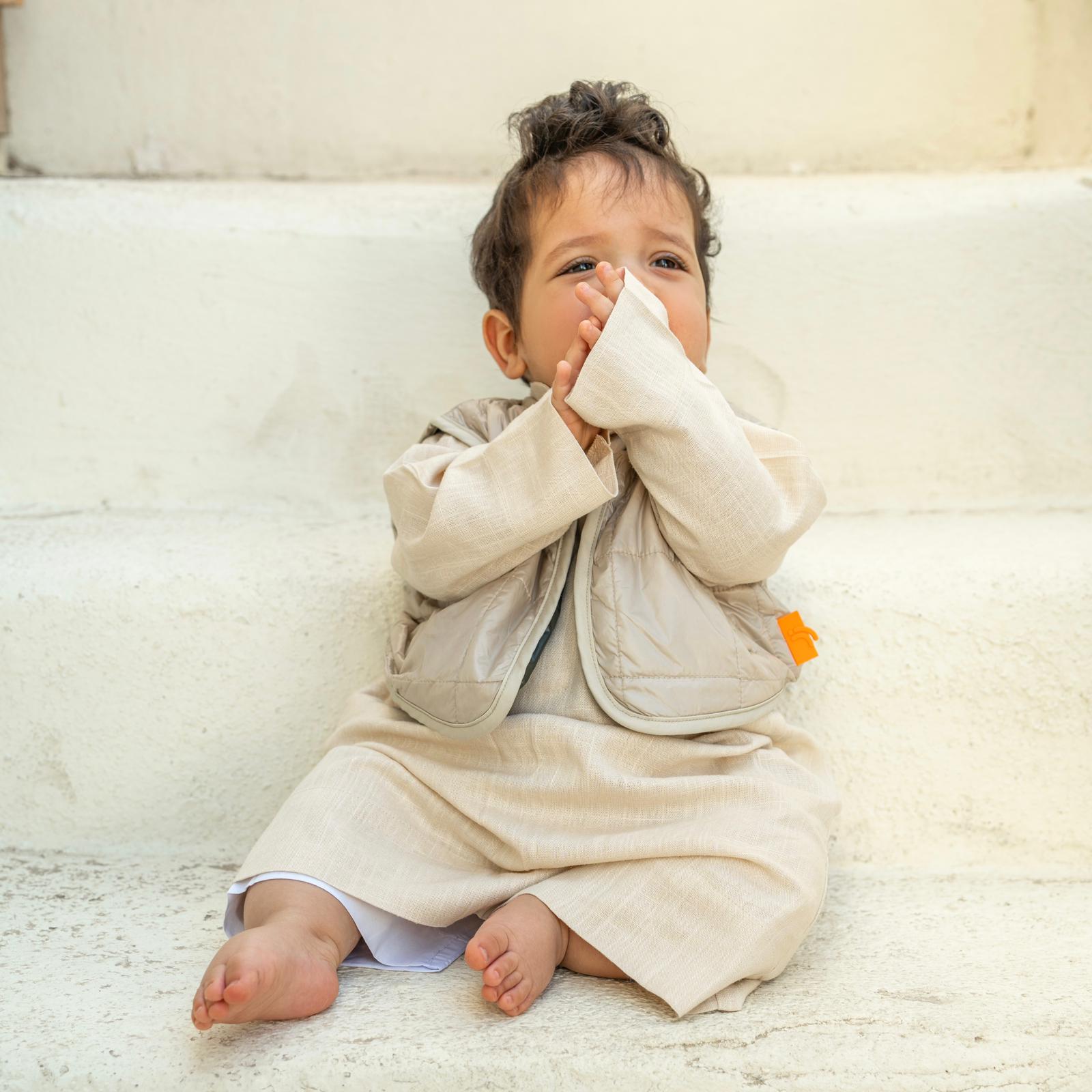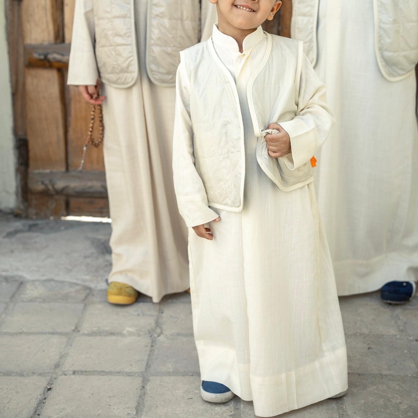 Basic linen dishdasha paired with a puff vest in the same color. The vest is crafted to Japanese standards, ensuring exceptional quality. The grid pattern is meticulously aligned, matching seamlessly from the front to the back—a hallmark of premium craftsmanship often seen in top Japanese brands.
